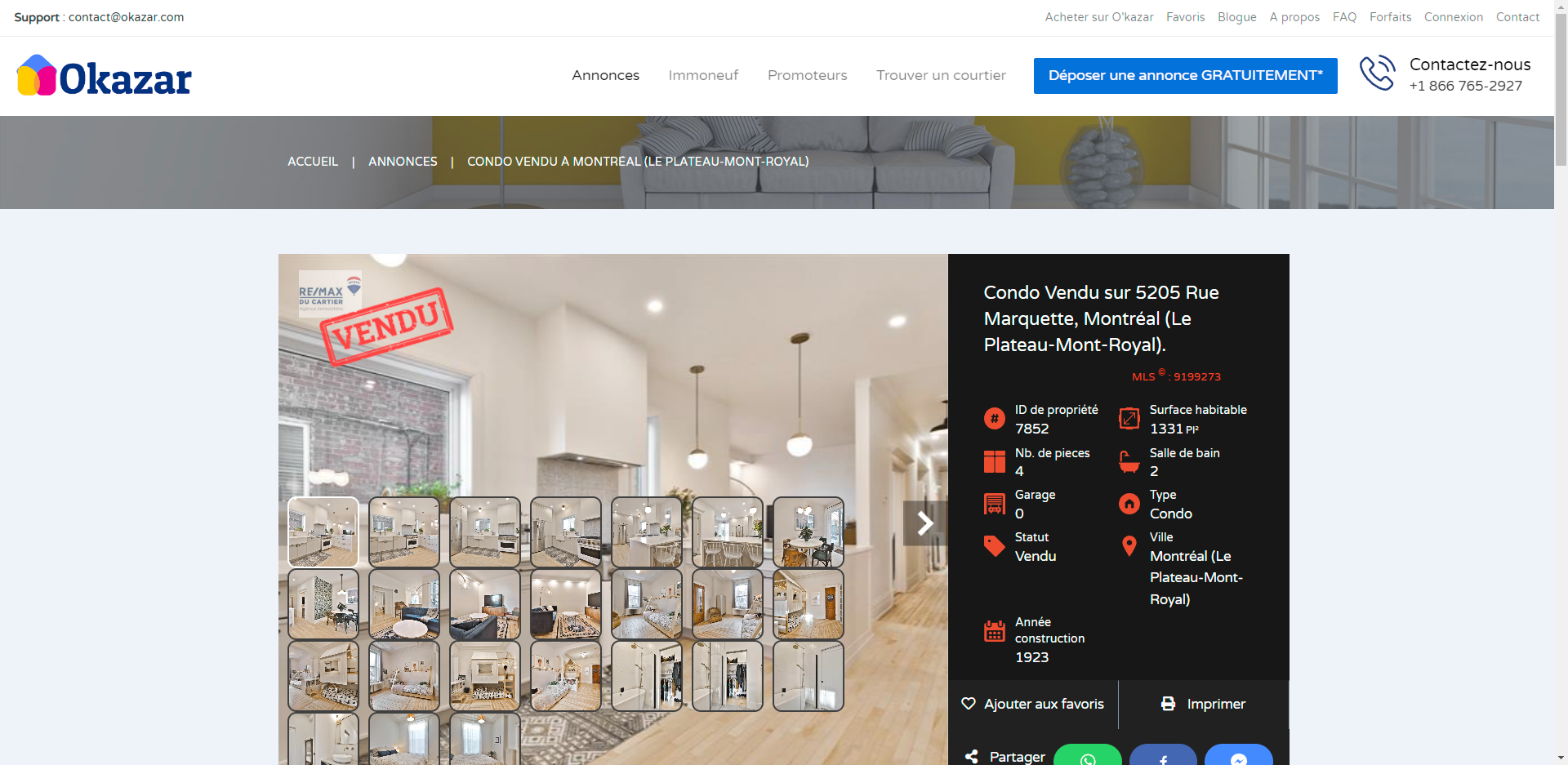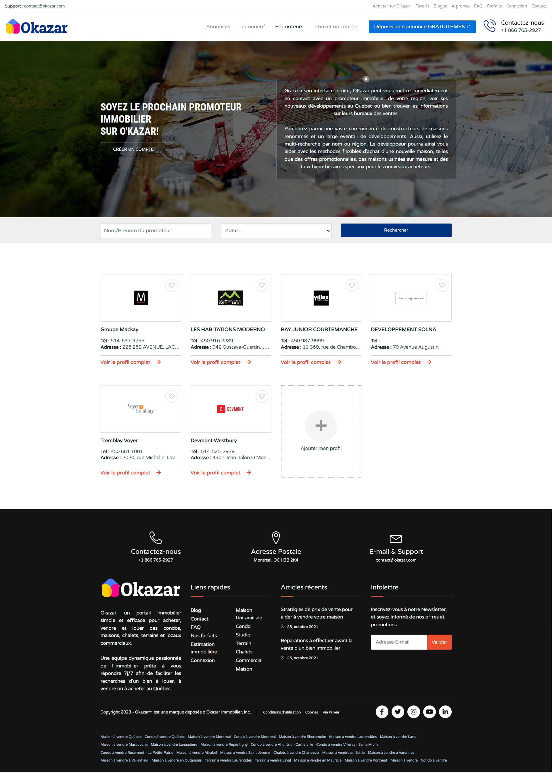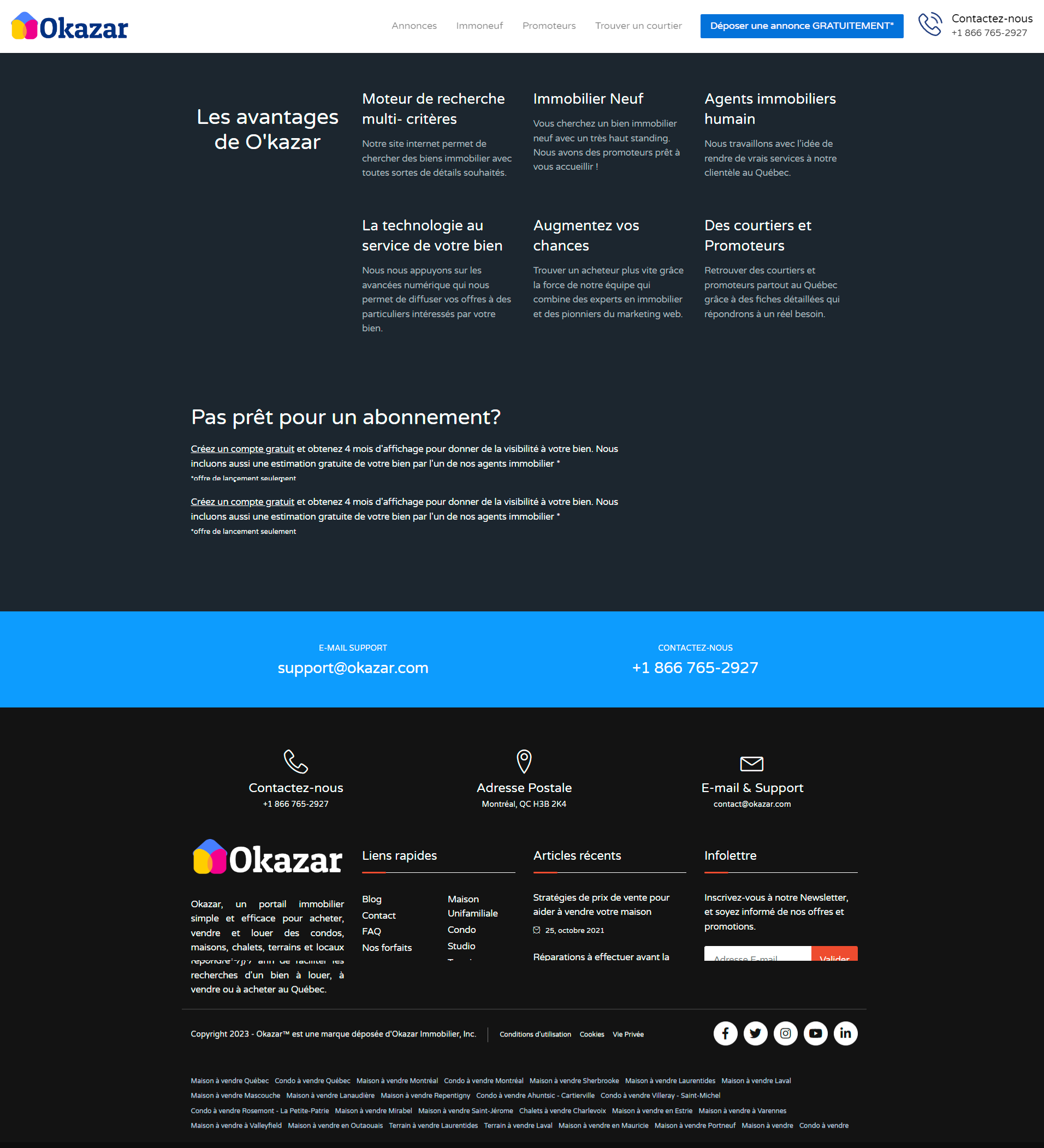 Okazar, c’est la clé d’un univers immobilier où simplicité rime avec efficacité. Que vous souhaitiez acheter, vendre ou louer des condos, maisons, chalets, terrains ou locaux commerciaux, Okazar est votre partenaire de confiance. Notre collaboration avec Okazar a forgé un espace numérique immersif où chaque clic ouvre la porte à une multitude de possibilités immobilières. En conjuguant design intuitif et technologie de pointe, nous avons créé une plateforme robuste qui répond aux divers besoins de ses utilisateurs. Au-delà du développement web, nous avons déployé une stratégie SEO avancée, permettant à Okazar d’émerger dans le paysage numérique, attirant ainsi un trafic organique de qualité vers leur site.